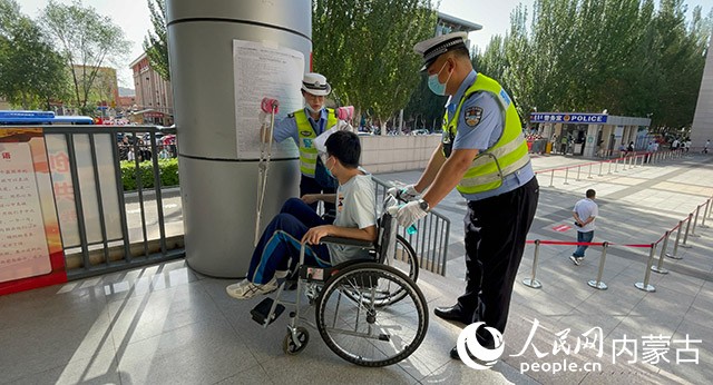 交警幫助行動不便的考生進入考場。呼和浩特市交管支隊供圖