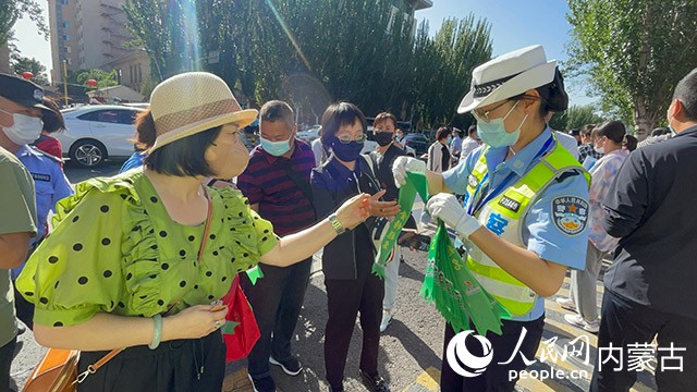 考生家長領取“綠絲帶”。呼和浩特市交管支隊供圖