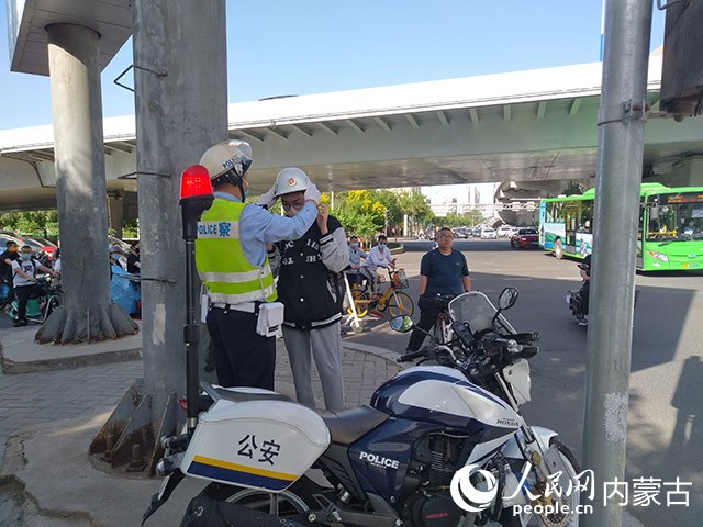 考生戴好頭盔趕赴考場。呼和浩特市交管支隊供圖