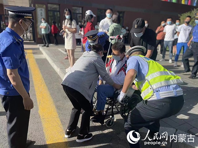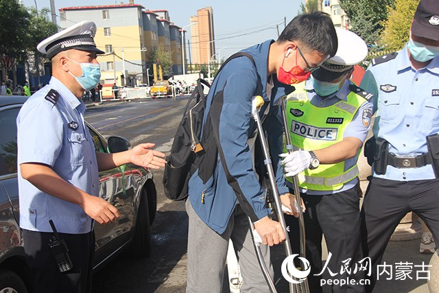 交警幫助骨折考生進入考場。呼和浩特市交管支隊供圖