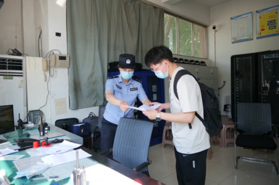 6月7日一早,在連云港灌南第二中學考點前,兩名考生向執勤民警求助稱身份證遺忘在家中,駐守在考點的灌南縣公安局新安派出所戶籍工作人員核實身份后,現場為考生出具臨時身份證明,同樣用時不到5分鐘,保障考生順利開考。