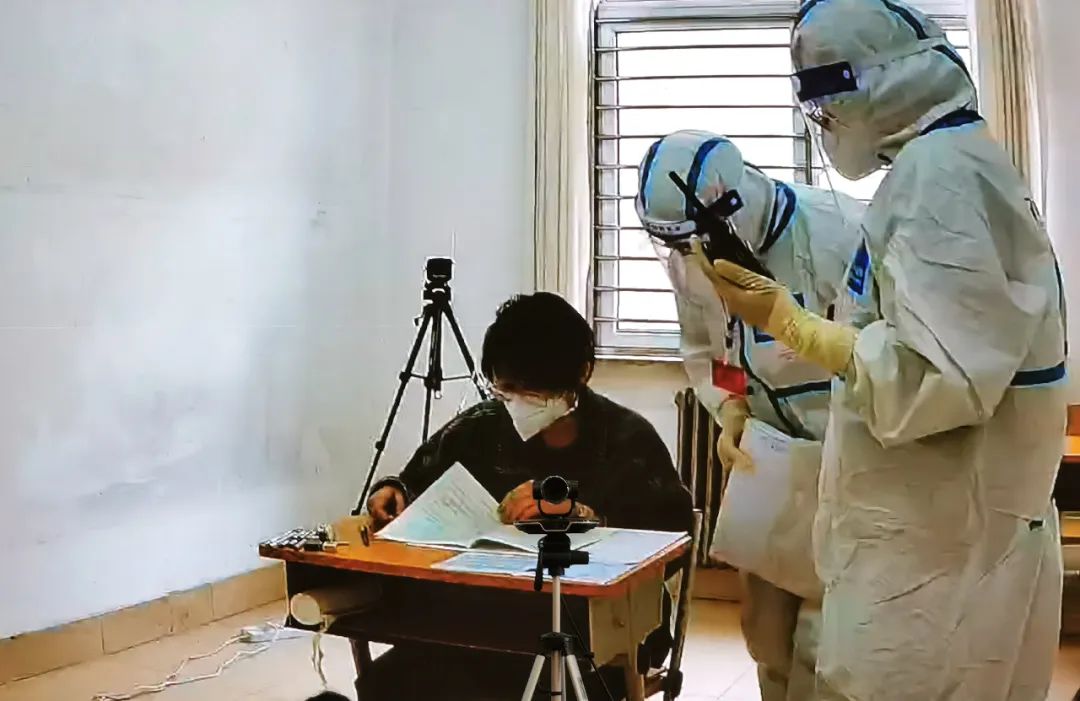 受疫情影響,在遼寧省丹東市的方艙醫院里,也專門設置了“特殊”的考場。這間考場里,有部分在接受隔離的考生,還包括1名正在接受治療的考生。