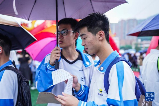 6月9日,貴陽市烏當中學高三學生在雨中閱讀父母寫給他的信。