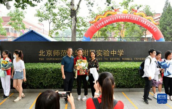 6月10日,在北京師范大學附屬實驗中學考點門口,考生家長和考生拍照留念。