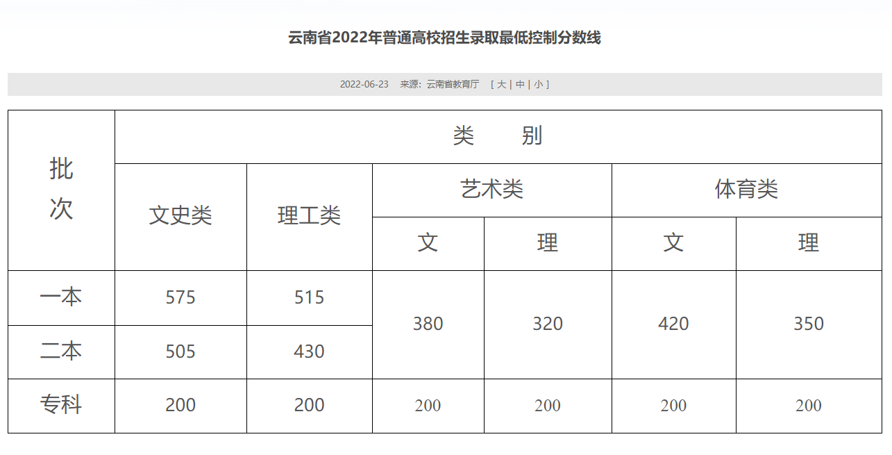 人民網北京6月23日電 (記者郝孟佳)據云南省教育廳消息,云南省2022年普通高校招生錄取最低控制分數線劃定:文史類一本575分、理工類一本515分;文史類二本505分,理工類二本430分。