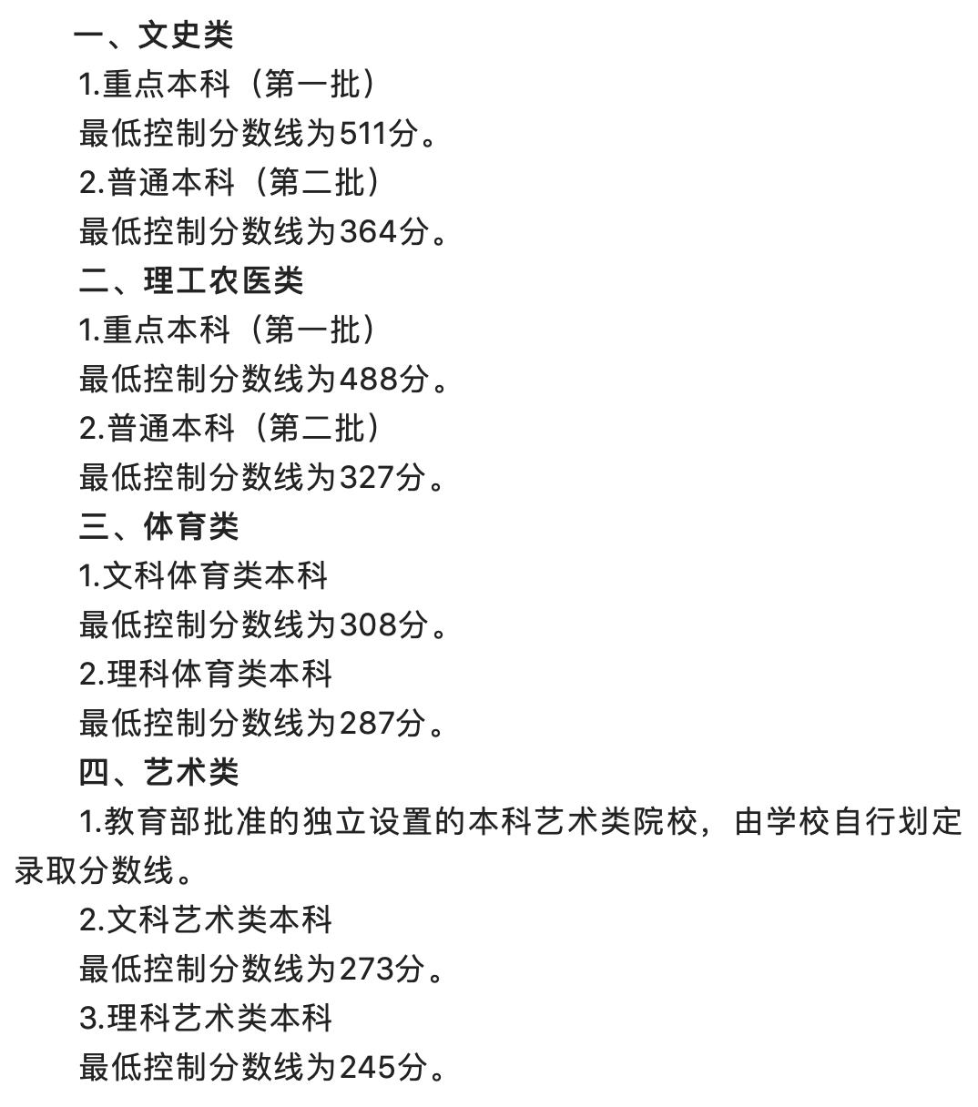 2022年吉林省普通高考本科各批次錄取最低控制分數線