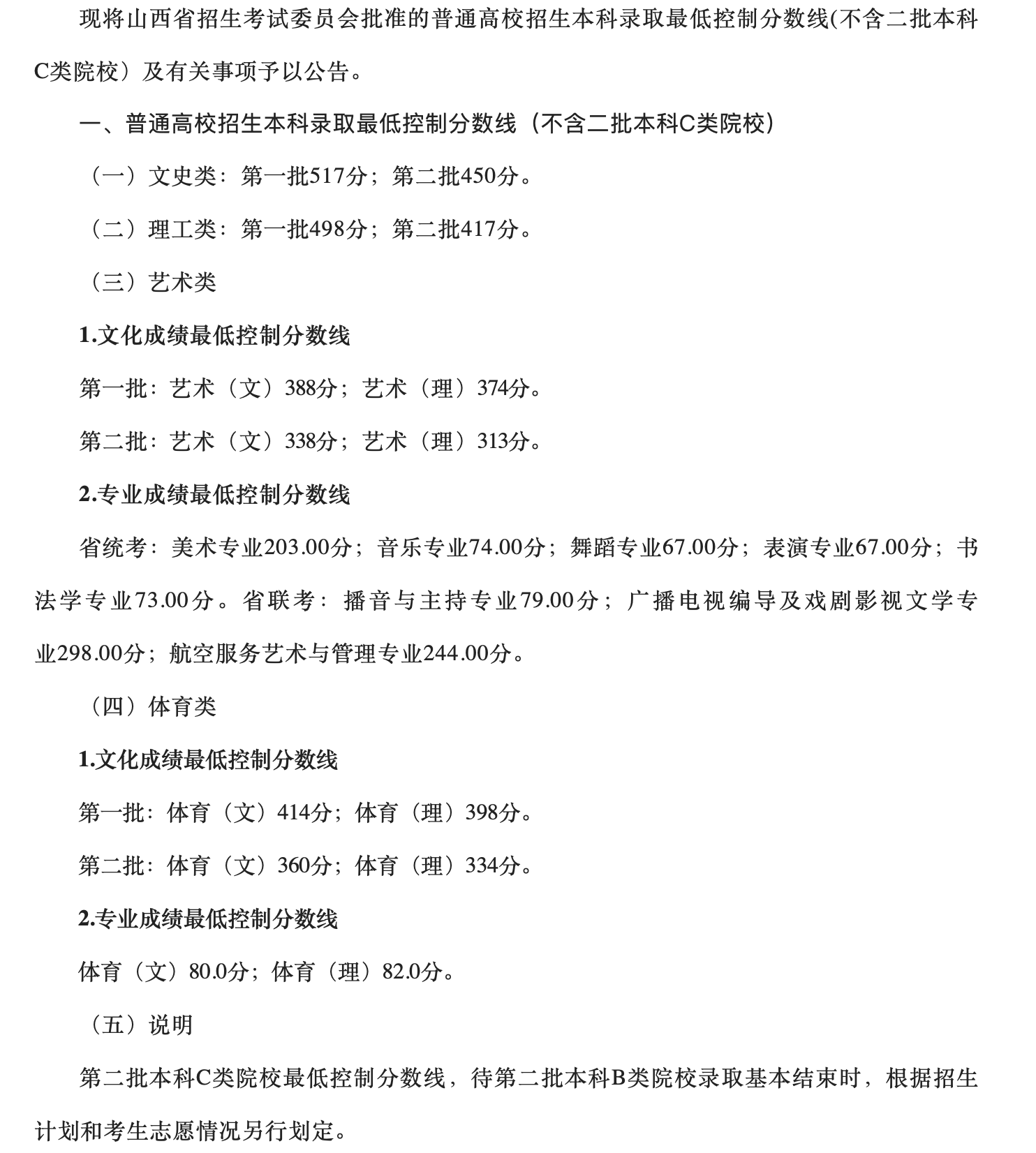 2022年山西省普通高考本科各批次錄取最低控制分數線