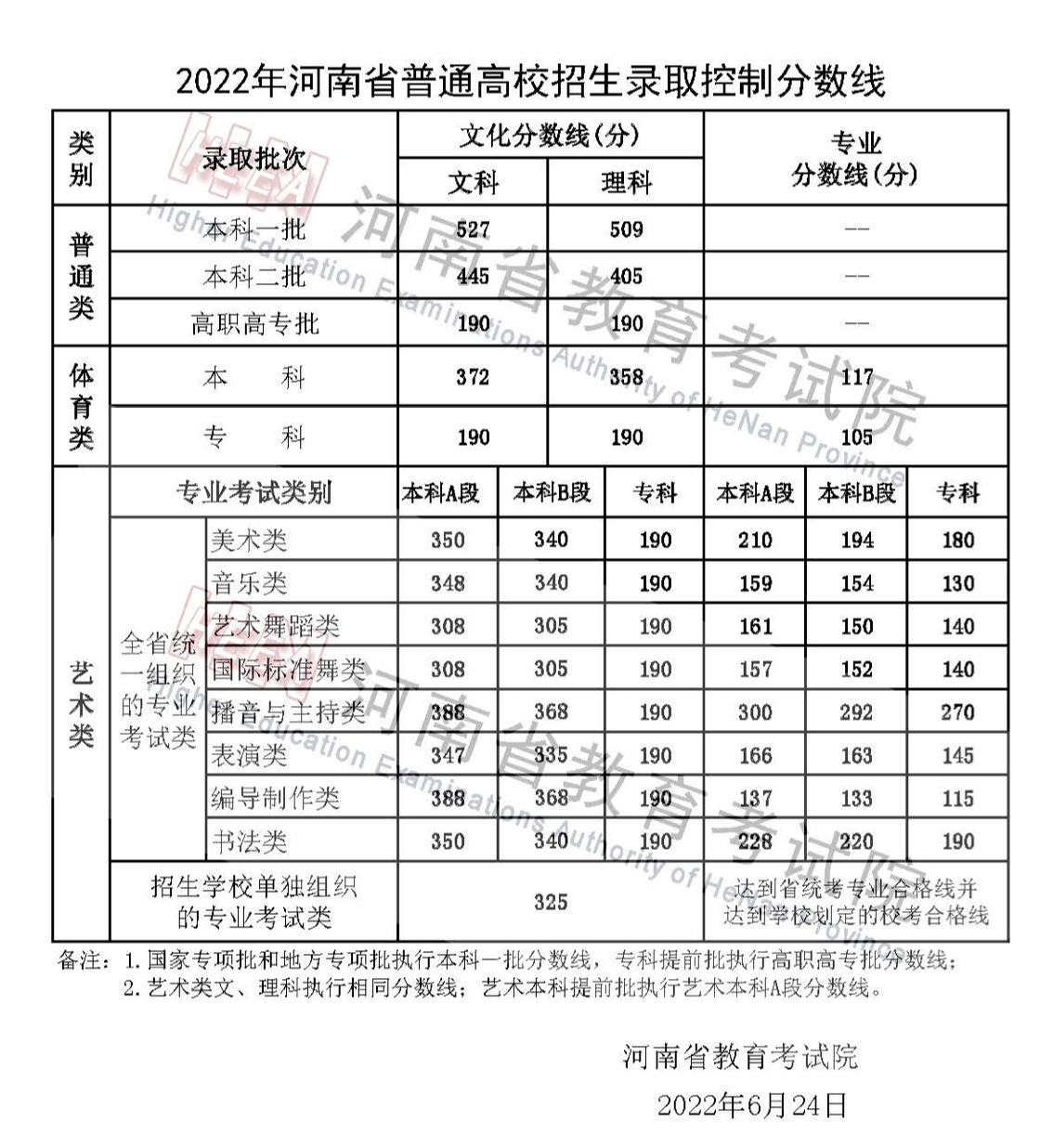 人民網北京6月24日電 (記者李依環)據河南省教育考試院消息,2022年河南省普通高考本科各批次錄取最低控制分數線劃定,其中普通類本科一批文科527分,理科509分;本科二批文科445分,理科405分。