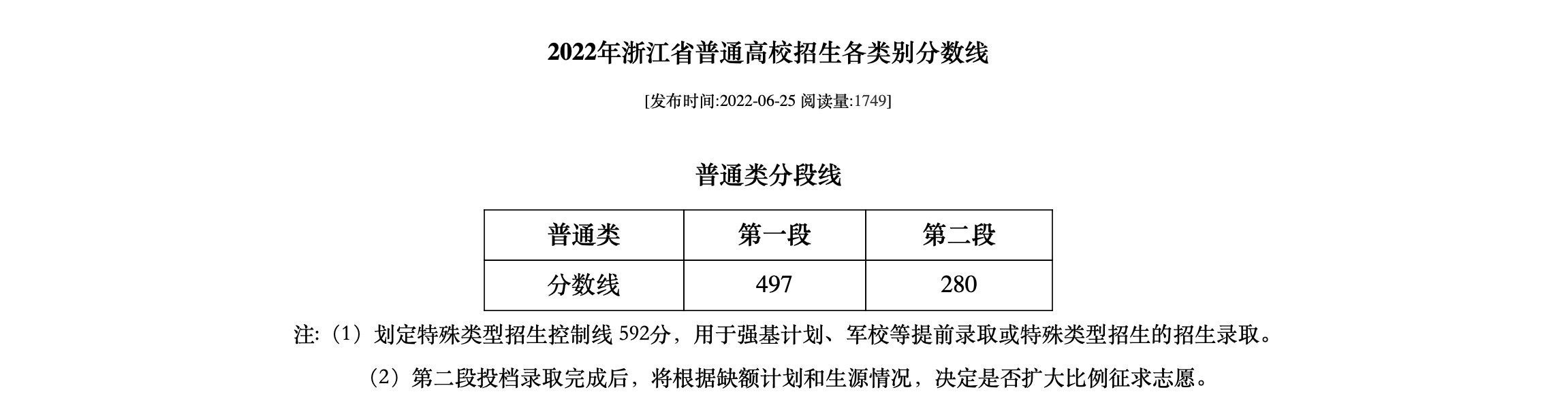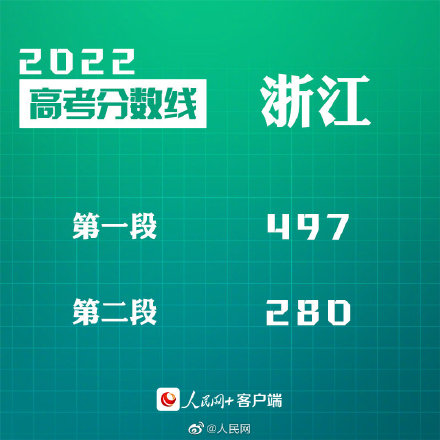人民網北京6月25日電 (記者李依環)據浙江教育考試院消息,2022年浙江省普通高考本科各批次錄取最低控制分數線劃定,其中普通類第一段497分,第二段280分。