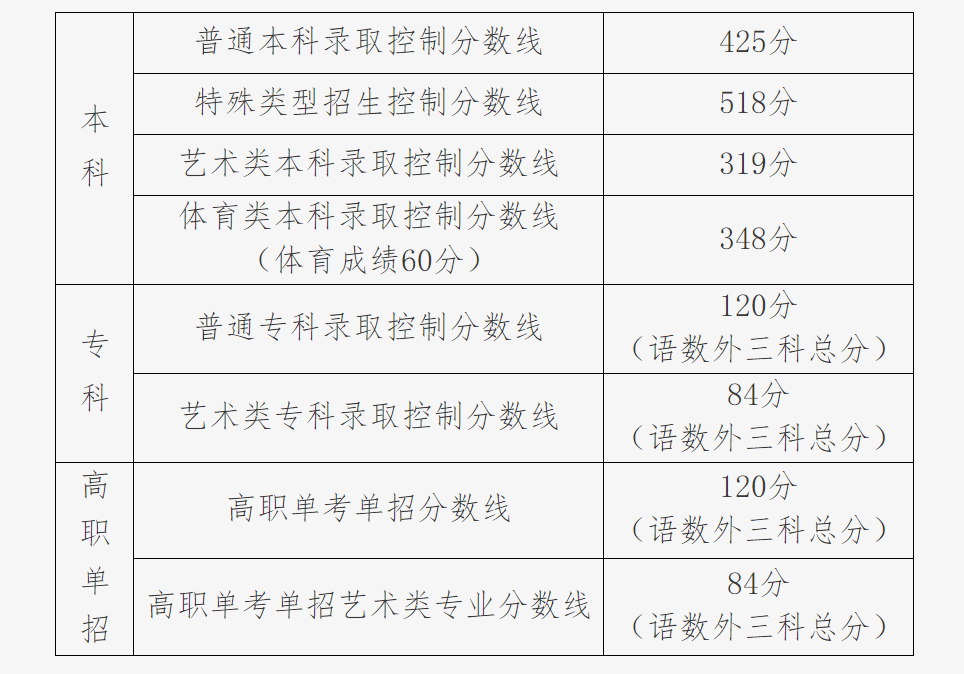 普通?其浫】刂品謹稻120分(語數外三科總分),藝術類?其浫】刂品謹稻84分(語數外三科總分),高職單考單招分數線120分(語數外三科總分),高職單考單招藝術類專業分數線84分(語數外三科總分)。