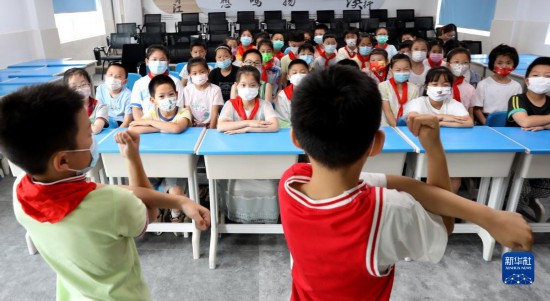 6月30日,在江蘇省蘇州市胥江中心小學校,兩名學生在學習游泳熱身操。
