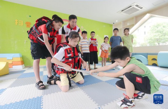 6月30日,在浙江省湖州市德清縣阜溪街道獅山社區博愛家園,孩子們在紅十字志愿者指導下學習水域救援伸縮桿使用方法。