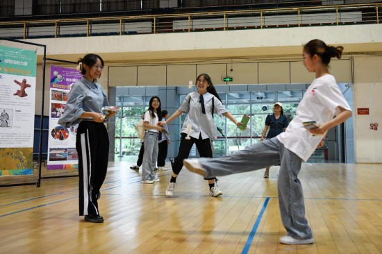 5月23日,在四川大學江安校區體育館,學生在體驗傳統體育項目踢毽子。新華社記者胥冰潔攝