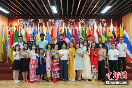 7月3日,廣西南寧,廣西民族大學留學生校友返校合影。中新社記者 王以照 攝