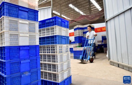 7月7日,在河北省邢臺市南和區南韓村的電商孵化基地,馮亞飛在倉庫內搬運貨物。