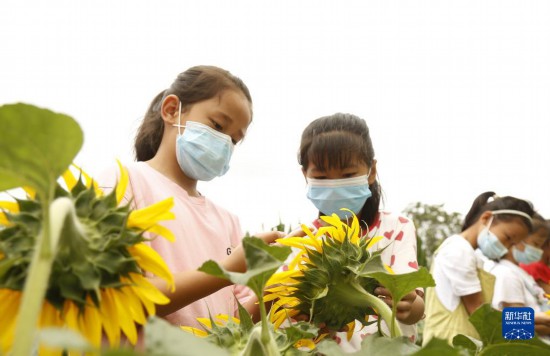 7月12日,在河北省邢臺市南康莊小學勞動教育實踐基地,參加暑期活動的孩子們觀察農作物生長情況。