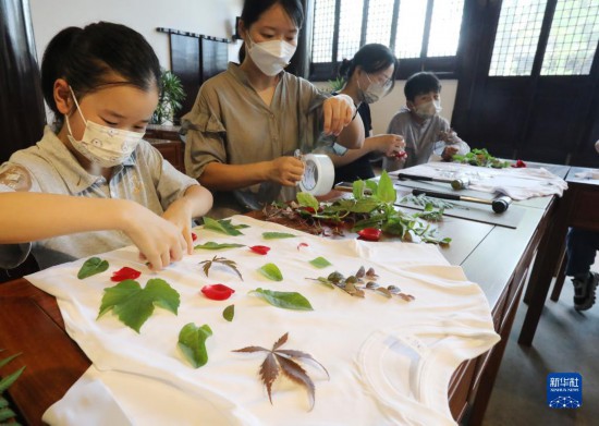 7月12日,在江蘇蘇州虎丘景區,家長陪同小朋友在體驗植物拓染。