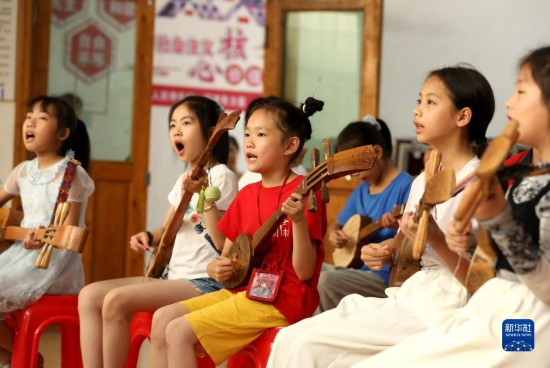 7月12日,廣西三江侗族自治縣文化館侗族琵琶歌班學生在彈唱琵琶歌。