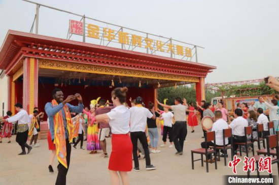 圖為浙江師范大學留學生參訪團與阿克蘇地區溫宿縣金華新村村民一起跳民族舞蹈。浙江師范大學供圖