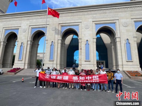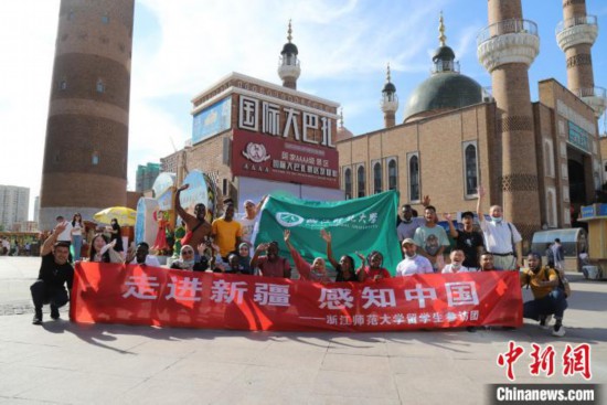 圖為浙江師范大學留學生參訪團在新疆國際大巴扎合影。浙江師范大學供圖