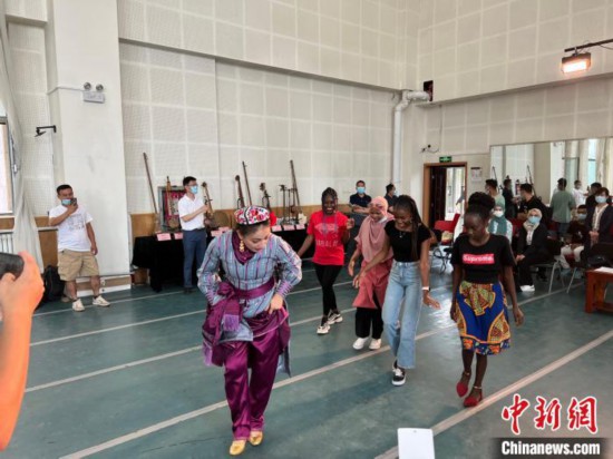 圖為浙江師范大學留學生參訪團在新疆藝術劇院木卡姆藝術團向專業藝術家學習舞蹈。浙江師范大學供圖