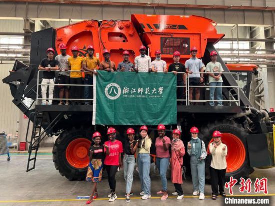 圖為浙江師范大學留學生參訪團在剛組裝完成的采棉機上合影留念。浙江師范大學供圖