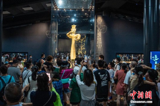 圖為三星堆博物館內的青銅大立人像吸引參觀者。 劉忠俊 攝