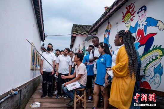 圖為外籍師生在綿竹年畫村了解年畫制作過程。 劉忠俊 攝