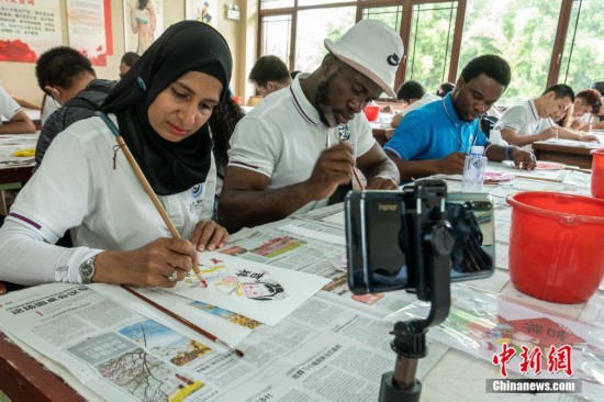 圖為外籍師生體驗綿竹年畫。 劉忠俊 攝