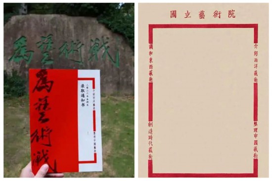 中國美術學院寄給學子們的錄取通知書封面上是林風眠先生所題“為藝術戰”四字,通知書的設計靈感源自國立藝專時期的信紙,上面還寫著“國美四句教”:介紹西洋藝術、整理中國藝術、調和東西藝術、創作時代藝術。