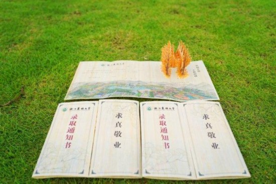 錄取通知書展開后,右上方呈現的是由刨切微薄竹制作的立體可折疊的銀杏樹林造型。銀杏樹林的底座則是兩條環抱相向的錦鯉,飽含學校對新生的祝福和期望。內頁底圖也換成了該校東湖校區的手繪實景地圖,方便新生入校前就可以熟悉校園環境。