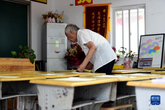 7月21日,葉連平在“留守未成年人之家”教室里為孩子們分發上課用的稿紙,并把桌椅擺放整齊。
