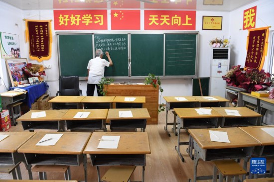 7月21日,葉連平在“留守未成年人之家”教室里為英語課準備板書。
