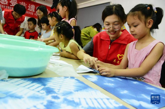 7月25日,在江蘇省鎮江市車站社區,江蘇大學志愿者在指導小朋友學習扎染制作技藝。