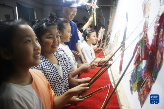 7月25日,皮影戲藝人在河北省唐山市豐潤區文化館指導小朋友表演皮影戲。