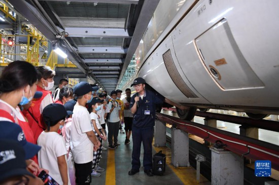 7月27日,合肥南動車運用所技術人員向小朋友介紹動車運維流程。