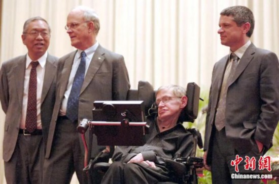 2006年,世界著名科學家丘成桐(左至右)、大衛·格羅斯(David Gross)、斯蒂芬·霍金(Stephen Hawking)、安地·斯特羅明格(Andrew strominger)出席國際弦理論大會。中新社記者 徐曦弋 攝