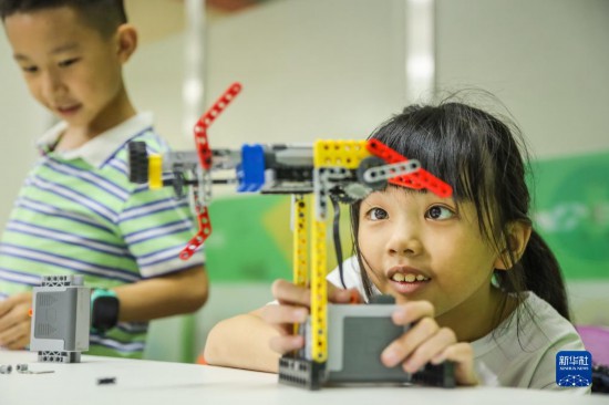 8月2日,在湖南省永州市藍山縣一培訓學校,孩子們在體驗機器人編程。
