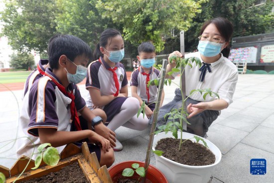 8月3日,在河北省石家莊市長安東路小學,老師(右一)為學生們測量太空種子植株。