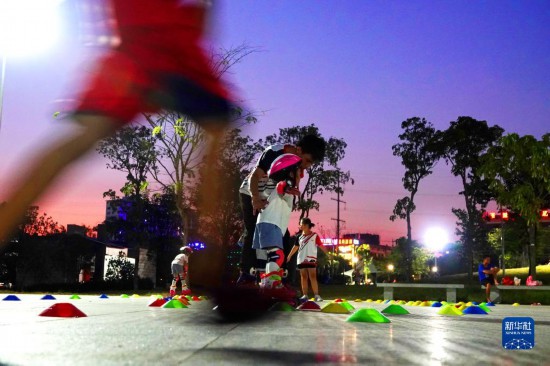 8月2日,在廣西南寧市明月湖濕地公園,孩子們在教練的指導下進行輪滑訓練。
