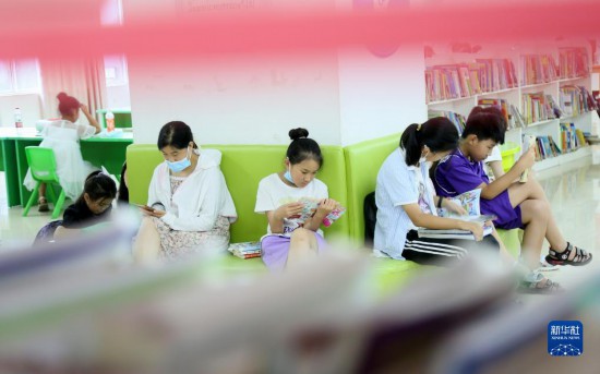 8月3日,在河南省洛陽市汝陽縣圖書館少兒閱讀室,學生們在閱讀書籍。