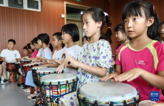 8月4日,在遼寧省沈陽市渾南區第九小學,參加暑期托管班的學生學習非洲鼓。