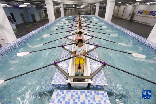 8月4日,在遼寧省沈陽市渾南區第九小學,參加暑期托管班的學生在賽艇池練習。