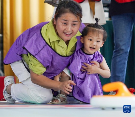 小朋友和家人一起參加“陸地冰壺”比賽(8月6日攝)。