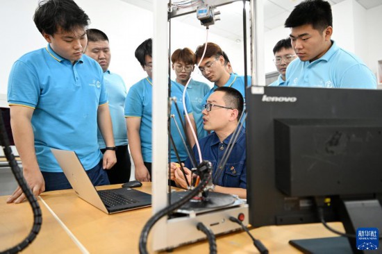 劉世雄(中)在天津機電職業技術學院的教室內給學生布置任務(8月8日攝)。新華社記者 李然 攝