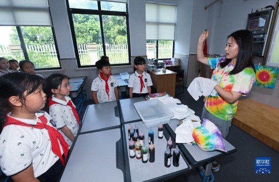 8月10日,湖州市吳興實驗小學的學生在“博學課堂”上學習傳統扎染。 新華社記者 徐昱 攝