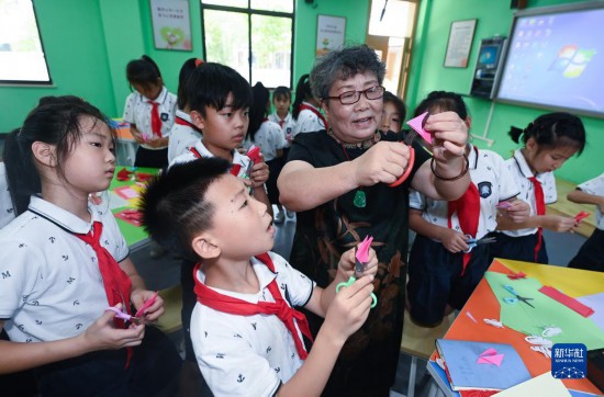 8月10日,湖州市吳興實驗小學的學生在“博學課堂”上學習剪紙。 新華社記者 徐昱 攝
