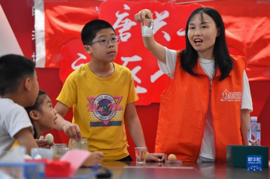 8月17日,在湘潭市雨湖區窯灣街道唐興寺社區,小朋友在觀看志愿者演示“浮起來的雞蛋”科學小實驗。