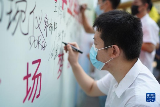 在位于南昌的江科附中高中部畢業典禮上,劉熙鴻在簽名墻簽名(8月13日攝)。