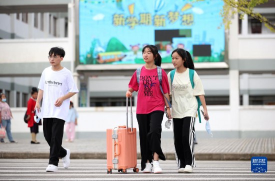 8月22日,貴州省黔東南苗族侗族自治州丹寨縣第二中學學生拿著行李走在校園里。